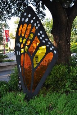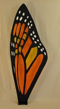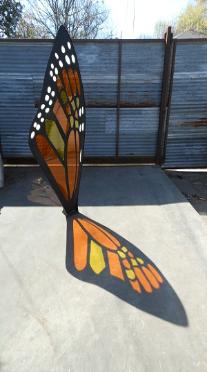 | Pascale Pryor Migration 1 I am attracted to the pattern of the butterfly wing, its vibrant colors and its vulnerability. This monarc butterfly wing represents the drive and the faith required to migrate for any species, including my own (I am an alien). The sculpture produces a several feet long, beautiful bright colored shadow when the sun shines through it. It should be installed on or near a concrete or other smooth surface to take advantage of the shadows it creates. The wing is 7 feet tall, made of colored plexiglass sandwiched between 2 sheets of painted steel reinforced on its edges and base. |
